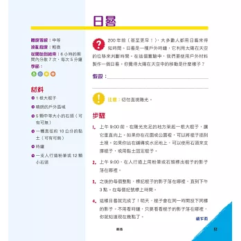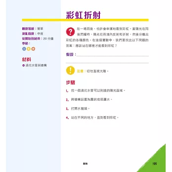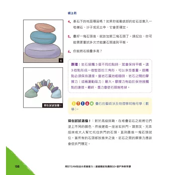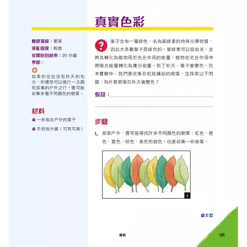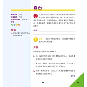 活動是專為小孩設計的,盡可能讓他們自己完成所有操作,而某些內容可能需要大人的一點幫助。每 個活動都包含了完成所需時間的資訊、難度分級、材料清單、步驟說明、背後的原理與原因、STEAM領域的重點資訊,以及延伸的有趣想法。