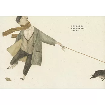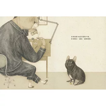 使用溫暖又柔軟的大地色系,以及流暢且粗糙的筆觸肌理描繪出內斂典雅的氛圍。在安穩雅緻的畫面裡,以小狗的主觀視角帶著我們觀看和想像牠眼中的世界,字字句句都透露著牠的心思和感情。無論是輕鬆愉快,抑或是無奈委屈,都展露在牠們的眼神和互動中,極富趣和玩味。另外,故事的整體風格與元素亦讓我們感受到生活中流動的文藝情懷。
