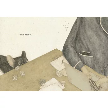 故事以一隻窩在懶人沙發的法國鬥牛犬作為開頭,牠悠悠哉哉地翻滾身軀和聆聽著在周遭的聲響。牠知道主人每天一早就會坐在桌前,甚至連衣服都不會替換,一邊喝著咖啡,一邊忙碌得打著字。