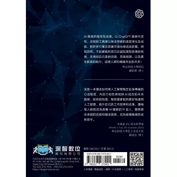 本書詳細探討了人工智慧(AI)與自然語言處理技術的最新發展,闡述了 AI 技術如何改變著人類的生活,並勾勒出未來共生的畫卷。本書首先回顧了ChatGPT 這一領域的突破。在這個知識迅速擴張的時代,以深入淺出的方式說明人工智慧的發展歷程,從圖靈測試 (Turing Test) 的觀念開始、早期的專家系統,到當今的深度學習和神經網絡。接著,本書深入剖析了這些技術如何應用於各個 AI 領域,例如:AI 繪圖、AI 音樂。在這個過程中,ChatGPT 這一技術得到了特別的關注,分析了它在文字生成、翻譯、情感分析等各方面的應用。