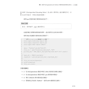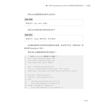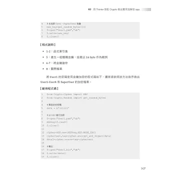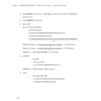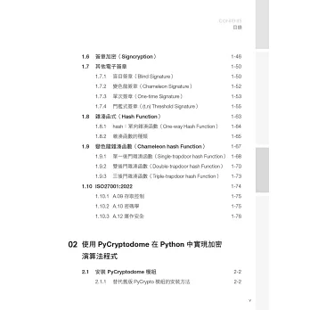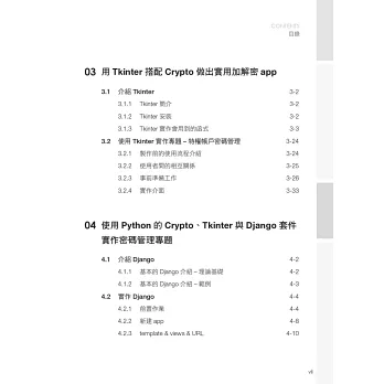 全書分成4章,分別帶領讀者進入密碼學的領域進行編程,除了有密碼學理論進行對照,還用時下最廣泛使用的程式語言 Python,進行密碼系統的開發。