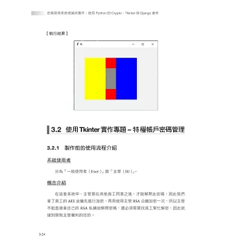 Tkinter 是視窗程式的開發套件,可實作使用者端的 UI,是 Python 用來開發應用程式的熱門函式庫。本書在每個範例程式碼都有說明與解釋,確定資料流後,完成實作上的輸入與輸出。