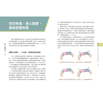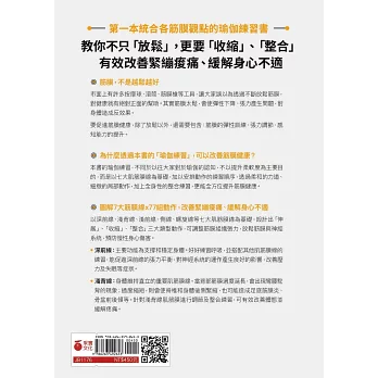 但本書的瑜伽練習,不同於以往大家對於瑜伽的認知,不以提升柔軟度為主要目的,而是以七大肌筋膜線為基礎、安排動作的練習順序,透過柔和的力道、細緻的局部動作,加上全身性的整合練習,更能全方位提升筋膜健康。