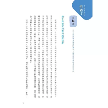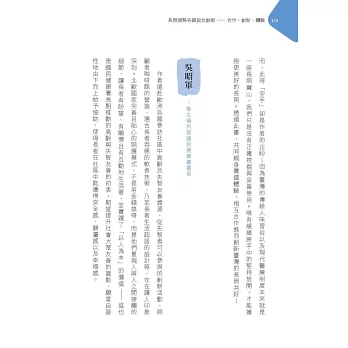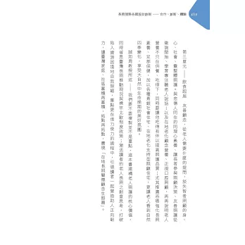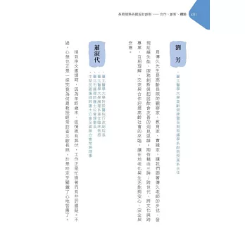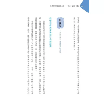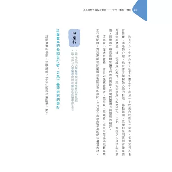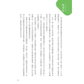 本書作者分享其他國家如何豐富長者生活的許多例子,共同特性是不以病人看老人,不以治療看服務老人,而是重視老人自主,支持自主因老化受限的人追求放鬆、快樂、做自己覺得有意義的事。