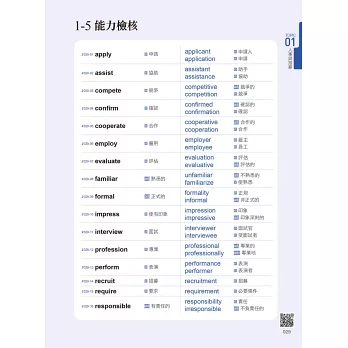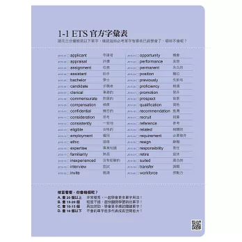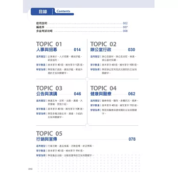 每個主題開始皆會說明該主題適用的情境類型,並有40個必考單字小測驗。透過測驗掌握自己對該情境的熟稔程度,不會的單字就馬上背起來,已經會的單字也別忘了複習。
