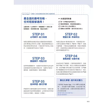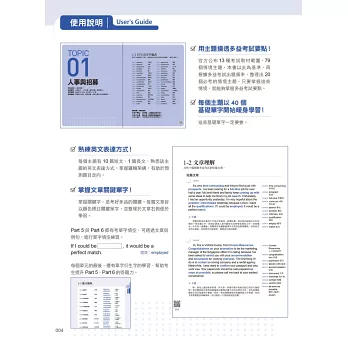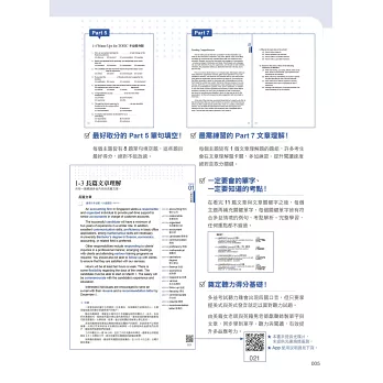 每個主題皆有10篇短篇文章、1篇長篇文章,文章內容適用於Part 4、Part 6、Part 7。透過大量閱讀,了解敘述的邏輯架構、掌握文章重點單字,就能熟悉該主題的單字與英文表達方式,面對各種題型都不怕。