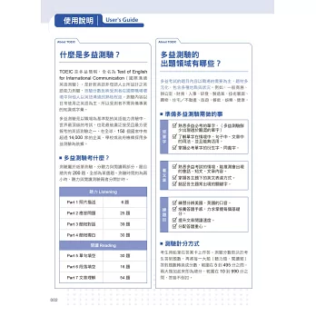 多益考試有7種題型,只要掌握基礎單字,就能應付Part 1、Part 2考題,再加上理解敘述的邏輯架構,回答Part 3、4的題目也沒有問題。而Part 5-7閱讀題是許多考生最容易卡關的地方,因此每個主題的實戰練習特別加強最容易取分的Part 5以及最需要練習的Part 7。透過練習檢測學習成效、培養解題手感。