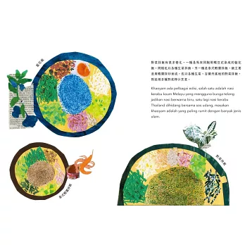 家附近就有可以摘採入菜的植物,對於生活在都市的我們是奢侈的幸福,這些彩色的花與葉能拌入帶有香味的米飯,提供吃飯的人健康又美麗的用餐感受。閱讀詩琴的作品一開始會著迷在他優美的構圖與拼貼技法,一邊認識到馬來西亞野菜拌飯的料理與典故,一邊學習如何製作一道色彩豐富、香氣迷人的南洋滋味。然後跟著書寫的文字走入內心,咀嚼到異鄉遊子濃濃的鄉愁與對親人的思念。吉蘭丹和我們所生活的家鄉一樣,也有人類開發環境,使得大自然中隨手可得的野菜日益減少的課題,透過他的作品,讓讀者感受到環境保護的重要:和動物們漫步在森林裡是多麽美好的時光,希望這不僅僅只存在於記憶之中。書本前頁有作者為我們朗讀馬來西亞語的QRcode,可以一邊翻頁閱讀,一邊聽她溫柔的聲音說故事,推薦給大家!——繪本作家 許增巧