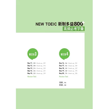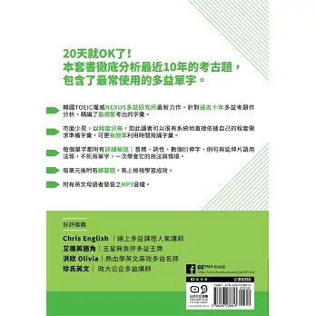 此外,千萬別忘了充分運用本書音檔,它可以幫助你進行聽力訓練,記憶核心單字,同時還能比較英式和美式發音的差異。 只要你能實踐這本書制定的20天讀書計畫,絕對可以在短期的未來達成多益滿分的夢想!