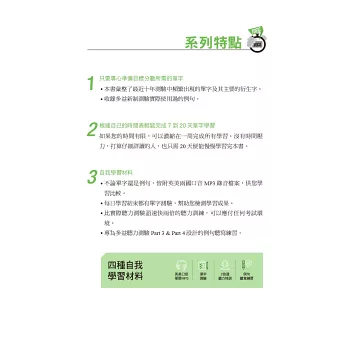 這套書就是多益字彙專門工具書,集結過去十年考題中出現頻率最高的單字、衍生字、同義字、搭配詞、考古題及考題仿真例句,目標很明確,就是幫助你在一個月之內提高100分。