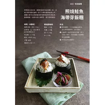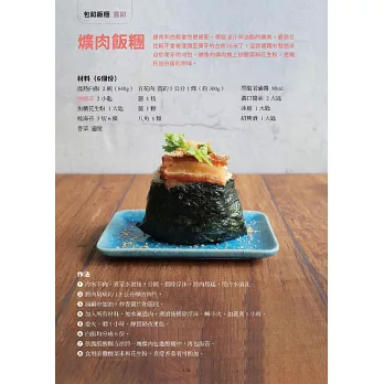 從家常的毛豆飯糰、蔥蛋飯糰,到異國風味的焦糖柳橙生火腿飯糰、玫瑰荔枝卡門貝爾飯糰;食材從山珍、海味、蔬果到方便的罐頭食品,經由巧手化身為餐盤上最美的風景。