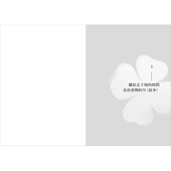人生不會因為無條件的相信和努力就變得幸福,有時候你必須捨棄,才會發現生活中真正重要的事情。當改變發生,你不一定要為此感到痛苦。這本書教你以優雅的姿態,帶著喜悅與更深層的使命感,接受挫折帶來的禮物。