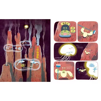 •主修動畫的作者結合深海生物、交通工具創造出獨特的角色,並以動畫分隔方式構圖,使畫面更豐富多彩,即使是黑漆漆的深海。