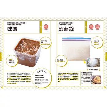 本書除了分享「肉類、海鮮、豆類‧蛋‧乳製品、蔬果類」的正確冷凍、解凍技巧之外,大家以往認為不可冷凍的馬鈴薯、黃瓜、奶油、豆腐、雞蛋、蒟蒻……等其實都可以冷凍,尤其是凍過的雞蛋,蛋黃會凝固變成軟綿的口感,享受更濃郁的滋味。從此不再擔心去大賣場搬貨回家,不會保存而放到壞掉爛掉喔!