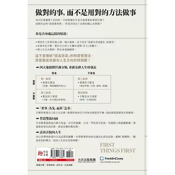 工作堆積如山,你以為更快速地解決問題是唯一解方,但事情只會更多卻不會減少。邀請你先檢視使用時間的方式,你是否只在處理「急迫」的任務,而非「真正重要」的人生使命?本書帶你回到內心的準則以校準人生,創造良好的生活品質。