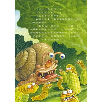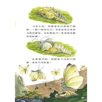 這些毛蟲是淡淡的橙黃色,身上有稀稀疏疏的豎起來的白色纖毛。牠們腦袋黑而發亮,充滿活力,非常醒目……這個「羊群」一旦接觸到草場—甘藍葉,就開始有了穩定的勞動。──摘自《昆蟲記‧卷十‧附錄二‧菜青蟲》