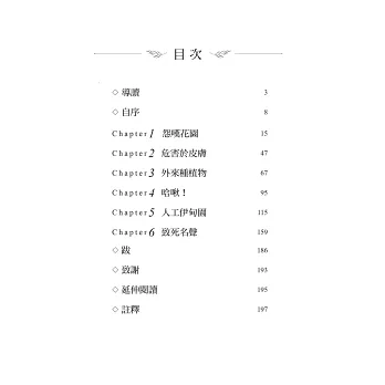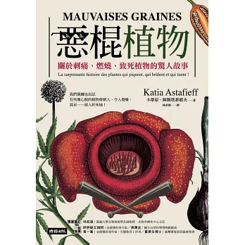 這本有趣的科普書,描述植物中各種化學或物理機制造成人類的困擾,看似讓讀者理解植物的惡棍行徑,卻非對植物進行貶低或批評,而是透過詳實的植物,讓人類理解植物的本事能力。植物不分好壞,對植物的喜惡來自人類的價值觀,但對人類有害的成分也可能成為未來的藥物,透過創意惡棍植物也能轉換為有用之物。我相信,這本書將激發您對植物的好奇心和探究欲,讓您對植物的多樣性有更深刻的體驗。 ——董景生博士|臺灣環境資訊協會理事
