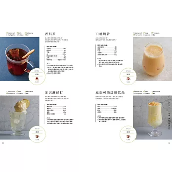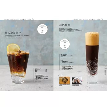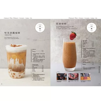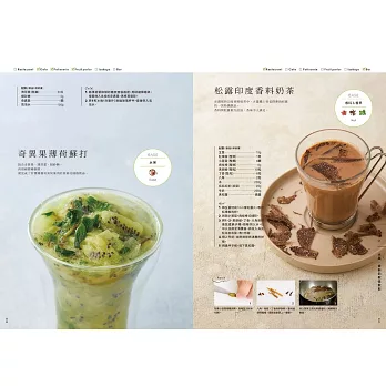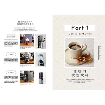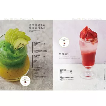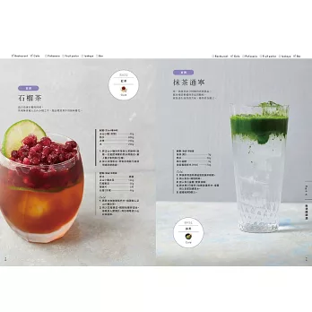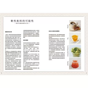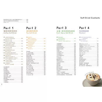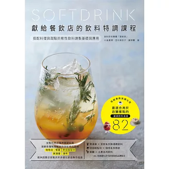★「82道」飲料食譜,涵蓋「咖啡軟性飲料」、「茶的軟性飲料」、「水果香料的軟性飲料」、「無酒精調酒」等四大主題。納入符合大眾飲食習慣的主流飲料的特質,並從中衍生出豐富的變化型品項。