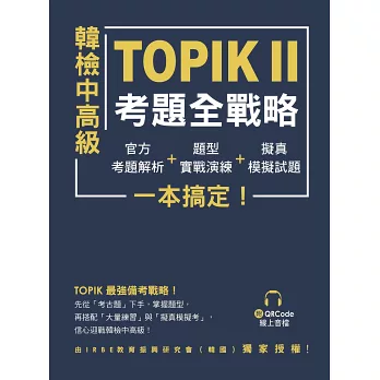 韓檢TOPIK官方自2020年起不再公開考古題,準備起來更加不易。來自韓國的「IRBE 教育振興研究會」團隊,因長期研究韓檢與韓語教育,不僅擅長抓出考點,猜題還十分精準。他們將研發成果濃縮在這本《韓檢中高級TOPIKⅡ考題全戰略》,替你節省寶貴時間,一次考取理想成績!