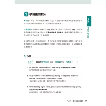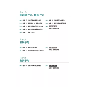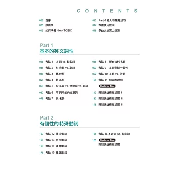 不知道自己的文法弱點在哪裡?本書在最前面提供了30題「多益文法實力速測」,每一題都各別對應本書的「文法考點」。讀者可以藉由這些題目檢測自己的弱項,若有疑惑之處可參考P.22「文法檢核表」,直接翻至對應的考點頁面來加強。