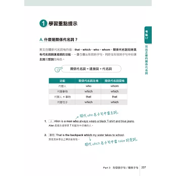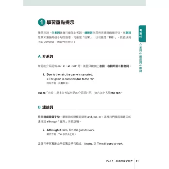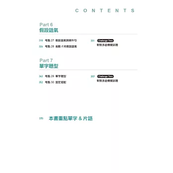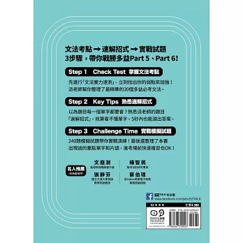 市面上文法書籍常常是講解完文法後才做測驗題,讀者很難判斷自己是否真的懂。本書在介紹每個文法之前會先提供1到3則例題,讀者可藉由例題迅速抓住考試重點,並同時掌握文法概念。派老師根據多年多益教學經驗幫你整理出「30個文法考點」,並提供獨家「速解招式」助你拿下文法分數。