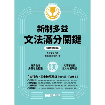 「大學執教英文三十多年,最棘手的就是幫助學生在多益考試中獲取高分。學生常反映,上課時文法都聽得懂,但一去考場,看到多益考題就束手無策。如李家同教授所言,大部分台灣大學生的文法很差,幾乎每寫一句就錯,而且錯得離譜,更不用說要應付多益靈活的題型。這本文法書是派老師專門針對新制多益所撰寫,不但架構清楚,每一章節的內容都用簡單的文字說明與表格,表達抽象複雜的文法概念及句型,加上舉例豐富,讀者一目瞭然,易於多益教學及學生自學。」—文庭澍/英語學習暢銷書作者