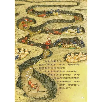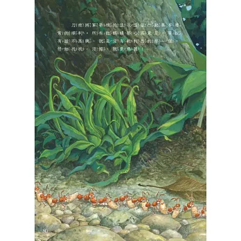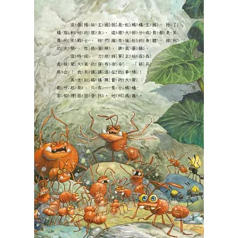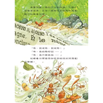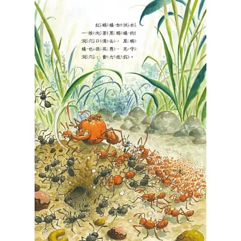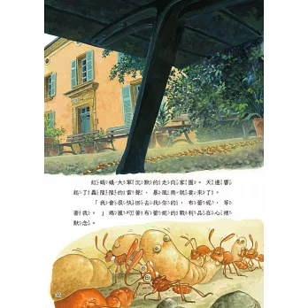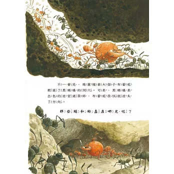 實驗室豐富的實驗品中,我把著名的紅螞蟻排在首位。……牠們不善於哺育兒女,不會尋找食物,不會料理家務,就連吃飯也得有人侍候。所以,紅螞蟻會去偷別人的「小孩」來侍候自己的家族,牠們搶劫鄰居的蛹,運到自己窩裡,等那些小傢伙褪去蛹皮,就成了紅螞蟻家積極工作的傭人。——摘自《昆蟲記‧卷五‧第九章‧紅螞蟻》