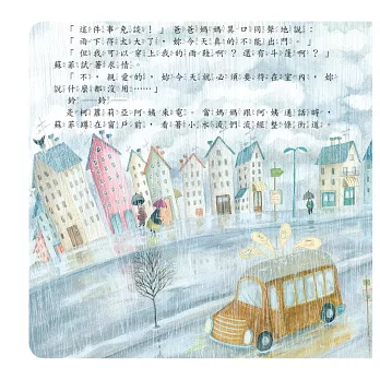 原先因為下雨而被迫取消跟朋友出去玩的約定的蘇菲心情很不好,得知父母不讓她出門玩但是卻願意開車出門探望阿姨之後,心情更顯得不公與氣憤,但是蘇菲意外在阿姨家過得很愉快,最後要分別時甚至依依不捨。這個故事告訴我們,雖然會有很多無法稱心如意的時候,但是若是不要抵抗隨之而來的各式轉變、順勢而為,說不定就能從其他人、事、物上發現驚喜。