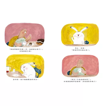 「《再等一下下!》巧妙對比不同情境之下的同一句話,讓讀者自然感受到人與人的特質差異沒有好壞對錯──無論你是烏龜還是兔子,我們都能彼此相伴,一起走到更遠的地方。」──巫佳蓮|兒童文學工作者、「故事鑄字行」版主