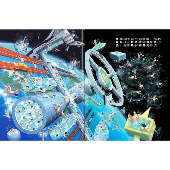 這邊有好多各式各樣的浴缸,大家可以一起洗澡開會的圓桌浴缸、跟高速公路一樣長的浴缸、可能會錯亂的迷宮浴缸…等,還有能在天空翱翔,甚至到宇宙探險的飛天浴缸,真是太好玩了!