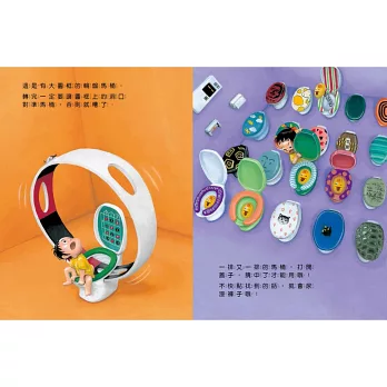 如果馬桶變得又軟又滑溜,那麼我們就要保持平衡才能使用;如果馬桶變得超~級高,又會是什麼樣子呢?想像一下,如果急著想上廁所的時候,卻發現馬桶變成輪盤遊戲,還要贏了才能使用…好多好多想法不斷出現,溜滑梯馬桶、迴轉壽司馬桶、火箭馬桶……哇,原來上廁所可以這麼好玩!
