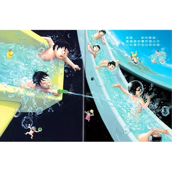 嗯,太陽下山了,好像該來洗澡囉!咦,為什麼浴缸變成圓球狀啊?等等,媽媽竟然邊洗澡邊煮飯,這是怎麼一回事呢?啊,爸爸也是,竟然在搭電車回家的路上就洗好澡了!