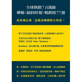 像坐雲霄飛車一樣刺激!劇情峰迴路轉,連去接小孩時都用電子書繼續追,完全不想中斷,一讀上癮的完美之作!——Goodreads書評,五顆星推薦