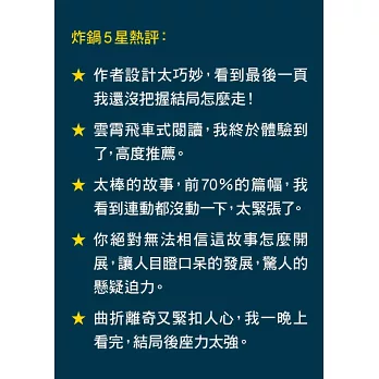 欲罷不能!……緊張刺激得不可思議……一頁接著一頁往下翻,最後完全不敢相信結局這樣走!——Goodreads 書評,五顆星推薦