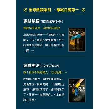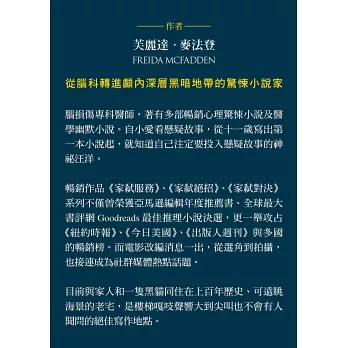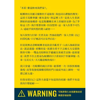 妮娜伸出美麗又優雅的手迎接我,我也回以禮貌的微笑。這屋子高雅華麗、應有盡有,到這裡工作,是我人生重新開始的最後機會,也是脫離睡在車上的絕佳安排,為了爭取這工作,我什麼都肯做。但沒想到,這一家人有著不可告人、遠超乎我所想的驚人祕密……