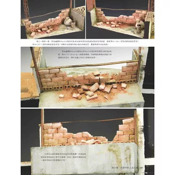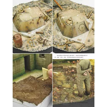 首先我們應該瞭解什麼是場景模型,談到模型製作,有人會認為場景或是情景模型就是模型製作的一種形式,將車輛、人物、建築物或是其他一些場景元素放在一個環境中。這樣說來,我將車輛、人物、建築物以及其他一些場景元素簡單而粗糙地擺放在一起,不論大小,就可以看成一個場景模型。這理解顯然過於膚淺。縱觀全書,大家可以看到我們並沒有強調場景模型的大小和規模,雖然這一點有時也非常重要。現在我們已經為大家介紹了場景和情景模型,大家可以看到我們更多探討的是對多種不同學科的瞭解。要做好場景和情景模型,我們或多或少需要掌握一些技巧:組裝和塗裝模型人物、模型動物以及模型車輛(它們可能是樹脂的、塑料的或金屬的),製作、塗裝和舊化各種建築物和結構模型(它們會有各種類型、大小和形狀),最後是將以上所有的要素有目的地整合到地形地台和環境中。