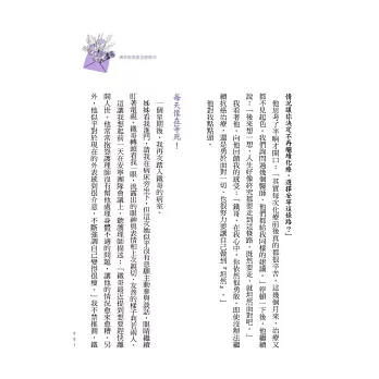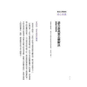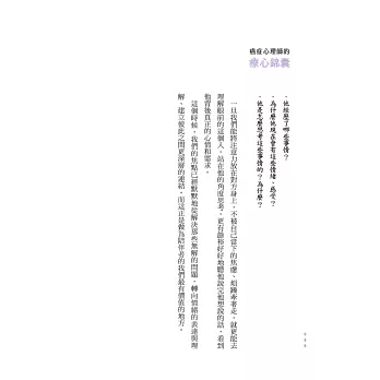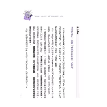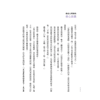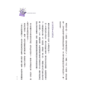 ●「沛宇對一位覺得自己不夠堅強的病人說:『把心裡複雜的感受簡化為挫折忍受度太低,對你來說並不公平。』我讀到這裡,很感動、也很喜歡這份體諒。要是有一個心理師,如沛宇一樣能接得住我的種種,那該有多好。──摘自馮以量推薦序。