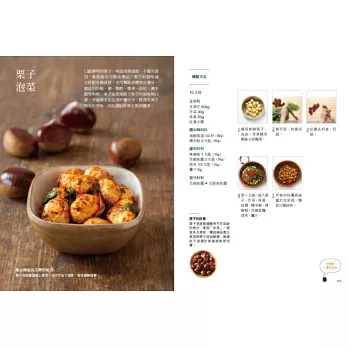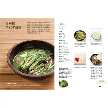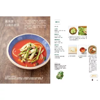 從白菜、蘿蔔、蘿蔔纓等常見的泡菜食材,到青江菜、小白菜、辣椒、栗子、蔥、芹菜、蓮藕等特別的泡菜做法,書中將逐一分析食材的特性,更容易掌握採買與採集的秘訣,不錯過每個季節的醃漬美味。