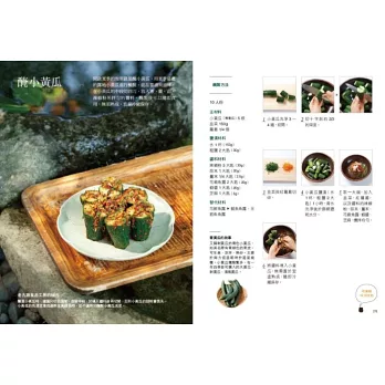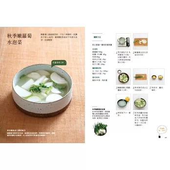 本書食譜按季節分類,首先是慢慢入味發酵的60道秋冬季醃製泡菜,接著介紹短時間浸漬的42道春季醃製泡菜、清爽風味的38道夏季醃製泡菜,總共收錄140道食譜,是可以隨時從冰箱取出食用的常備菜。