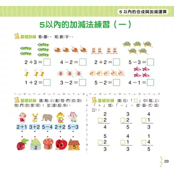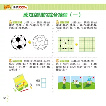 《數學1000題》題型涵蓋孩子在入學前至國小一年級需要掌握的數學能力,包括100以內加減法、比較、數序、分與合、圖形、規律、統計、認識時間、日曆和錢幣等,提早奠定孩子的數學基礎,為國小學習生活做好充足的準備。