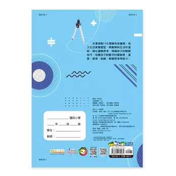 採108課程綱要,全新編撰題型著重數學課程的連貫性與關聯性新增數學素養題,題型難易適中採用單元式主題,奠定良好基礎附參考答案,方便學生自修學習啟發式解題技巧,歸納相關題型國小必備輔助教材,適用各版本