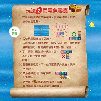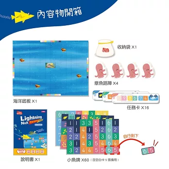 遊戲配件:海洋底板x1、章魚路障x4、任務卡x16、小魚牌x60