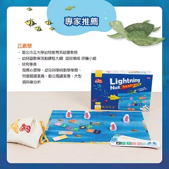 「Kid’sCorner 數學區的教玩具很值得推薦,它讓幼兒藉由實際動手操作中察覺及學習數學概念,而非單純練習背誦的學習。每種遊戲設計的題卡由簡單到複雜分不同玩法引發學習動機,也逐步建構數學概念。 」──節錄自《閃電魚尼克數感遊戲》說明書