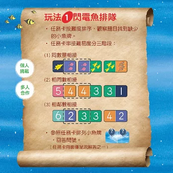 任務卡按難度取用,參照題目排列,並找到缺少的小魚牌。