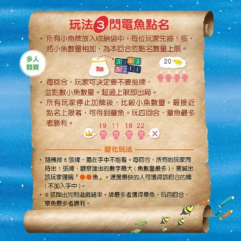 隨機抽6張牌,蓋在手中不能看。每回合,所有玩家同時出1張牌,觀察誰出的數字最大(魚數量最多),需喊出該玩家暱稱「○○魚」。速度最快的人獲得該回合的牌(不加入手中)。6張牌出完則遊戲結束。牌最多者獲得章魚,玩四局,章魚最多者勝利。