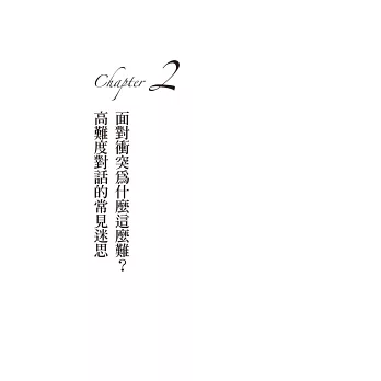 於是,有了這本書《衝突對話,你準備好了嗎?》的誕生。衝突對話,當然是高難度對話,因為只要沒說好,轉瞬間就變成衝突。因為我們害怕衝突,愈逃避的事愈會成真。我們希望這本書可以幫助人們在面對一些不好談、很難開口的事情時,先準備好裝備,知道自己可能會遭遇哪些反應後,再勇敢面對。不需要像過去一樣,碰到難解的人際問題,總覺得自己是赤裸上戰場。