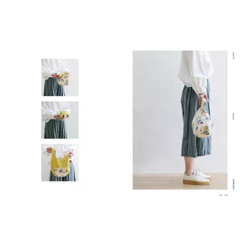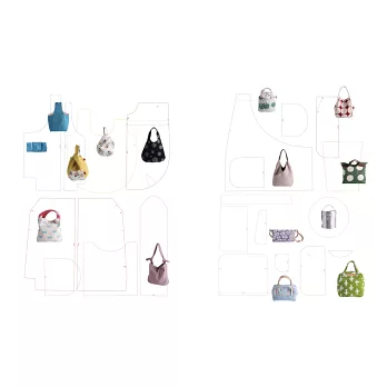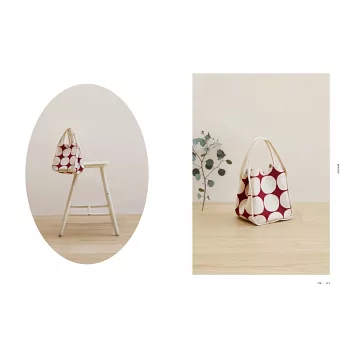 雙面的布料搭配能帶來各種風格可能。將扁包的袋底改成圓形,包款更活潑;袋底因車縫兩尖褶而呈現可愛的立體感;並延伸單提把設計,變化成背心款的長短提把。做包的各種小心機是不是非常有趣呢!