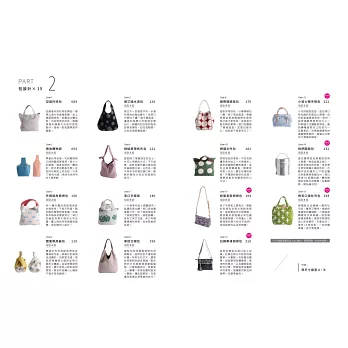 側襠結合拉鍊繞一圈的吐司包,做為最後一款作品,實用又獨特。裡袋前後箱型包邊縫製,八個弧度轉彎角完美車縫一致對稱是練習重點;微斜布製提把加上彩色鉚釘,可愛加分。做完15款包後,一定收穫滿滿,技巧更進階。