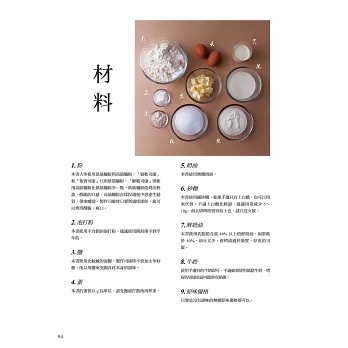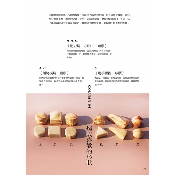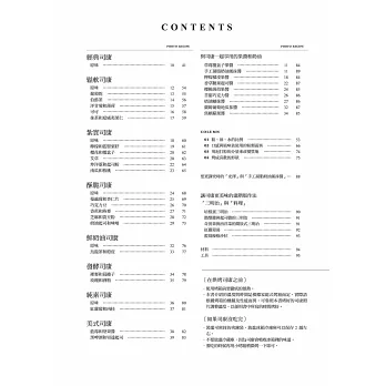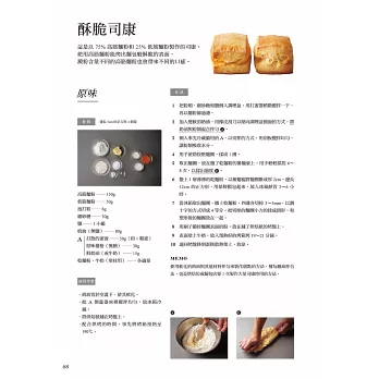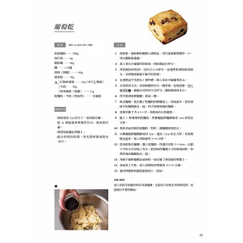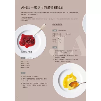 司康的基本食材相對簡單,所以適合透過不斷嘗試,來找到喜歡的口感和風味。作者透過自己的經驗,分享不同的泡打粉分量能做出截然不同的質地、油分及水分的多寡如何影響口感、製作球形等不同形狀時的製作要點等,幫助讀者一步步做出自己喜歡的司康。
