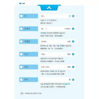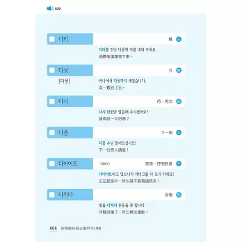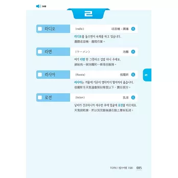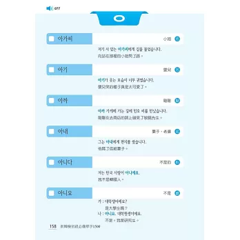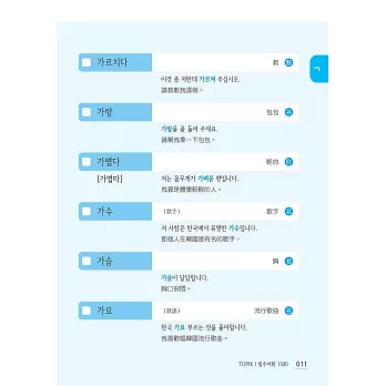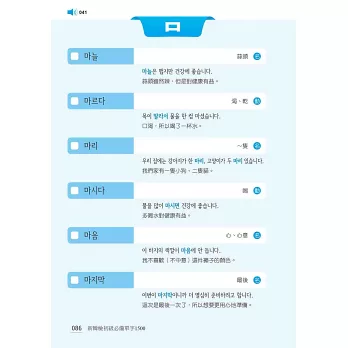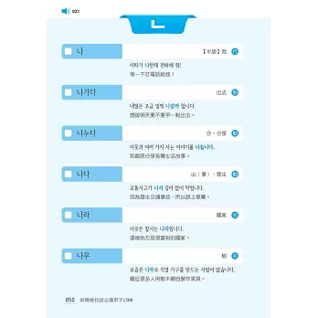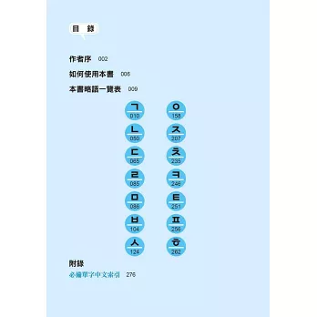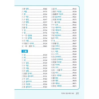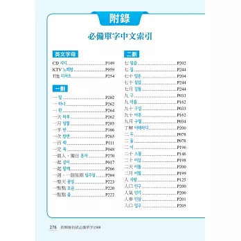 全書最後亦附上所有「必備單字之中文索引」,依「筆畫順序」排列,並標示出韓文,兼具中韓辭典功能,查找迅速又方便,一目瞭然!